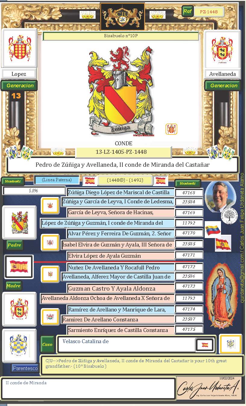 Padre: López de Zúñiga y Guzmán, I conde de Miranda del Castañar Diego Madre: Avellaneda Aldonza Ochoa de Avellaneda X Señora de Conyugue: Velasco Catalina de