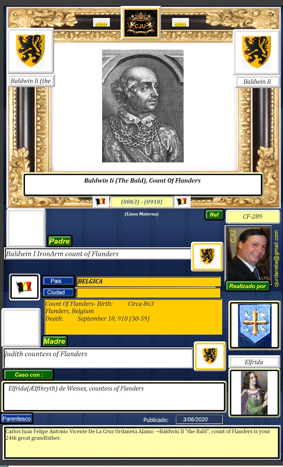 Baldwin II "the Bald", count of Flanders is your 24th great grandfather.of→ Carlos Juan Felipe Antonio Vicente De La Cruz Urdaneta Alamo→ Morella Álamo Borges