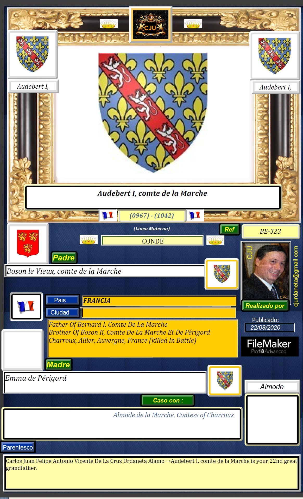 22° Bisabuelo/ Great Grandfather de: Carlos Juan Felipe Antonio Vicente De La Cruz Urdaneta Alamo →Audebert I, comte de la Marche is your 22nd great grandfather.