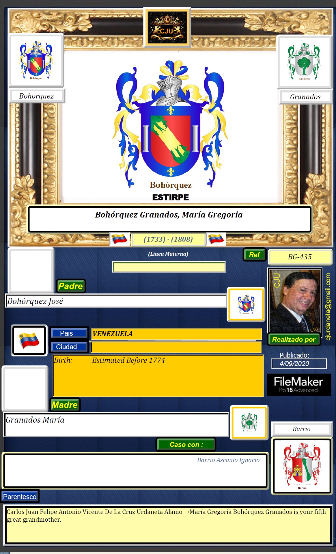 María Gregoria Bohórquez Granados is your fifth great grandmother.of→ Carlos Juan Felipe Antonio Vicente De La Cruz Urdaneta Alamo→ Morella Álamo Borges