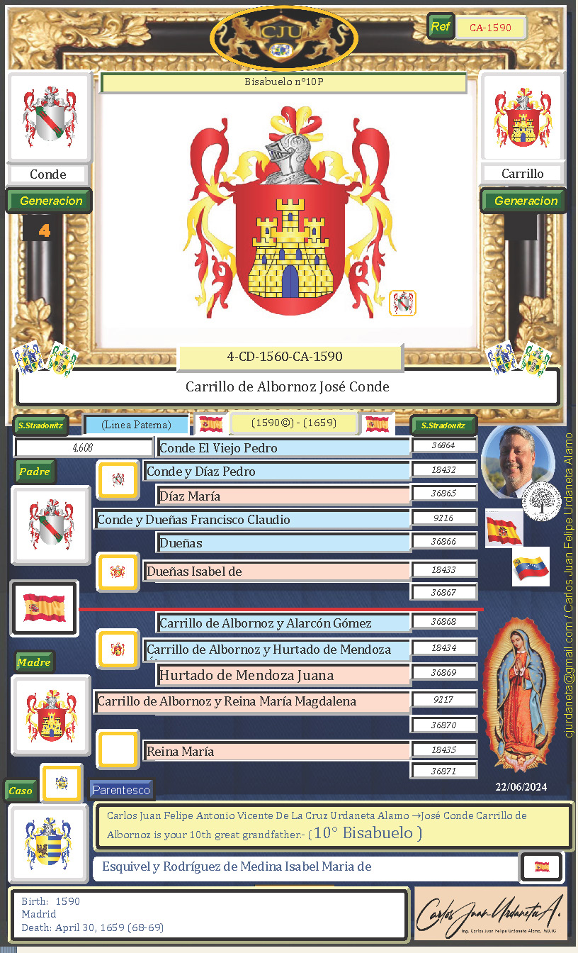 José Conde Carrillo de Albornoz is your 10th great grandfather.of→ Carlos Juan Felipe Antonio Vicente De La Cruz Urdaneta Alamo→ Dr. Enrique Jorge Urdaneta Lecuna