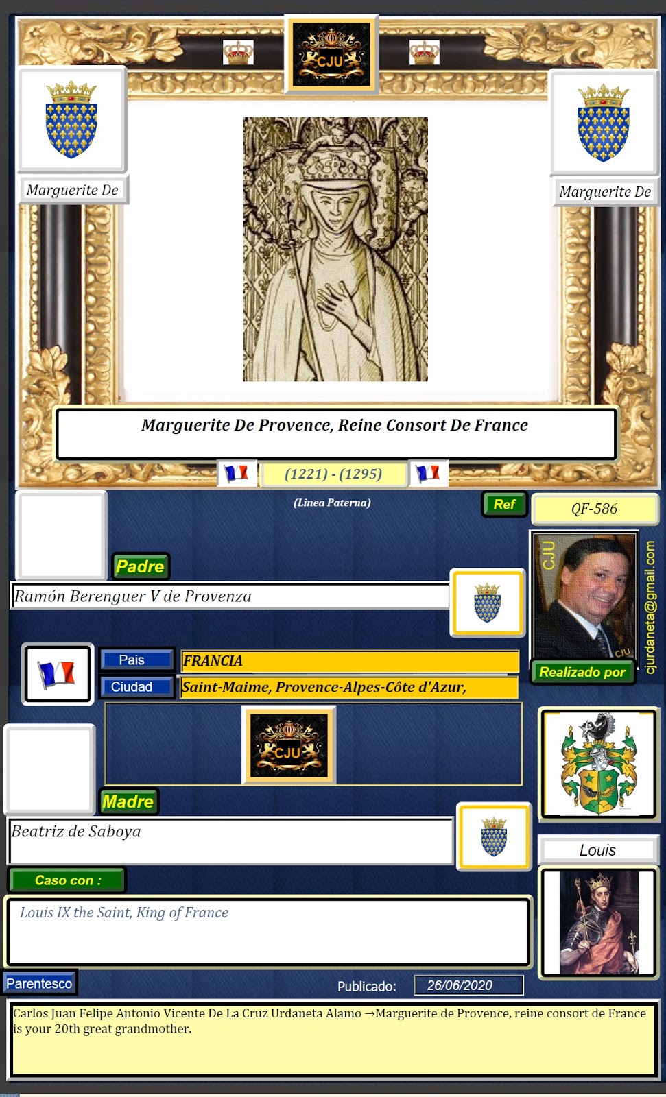 Marguerite de Provence, reine consort de France is your 20th great grandmother.