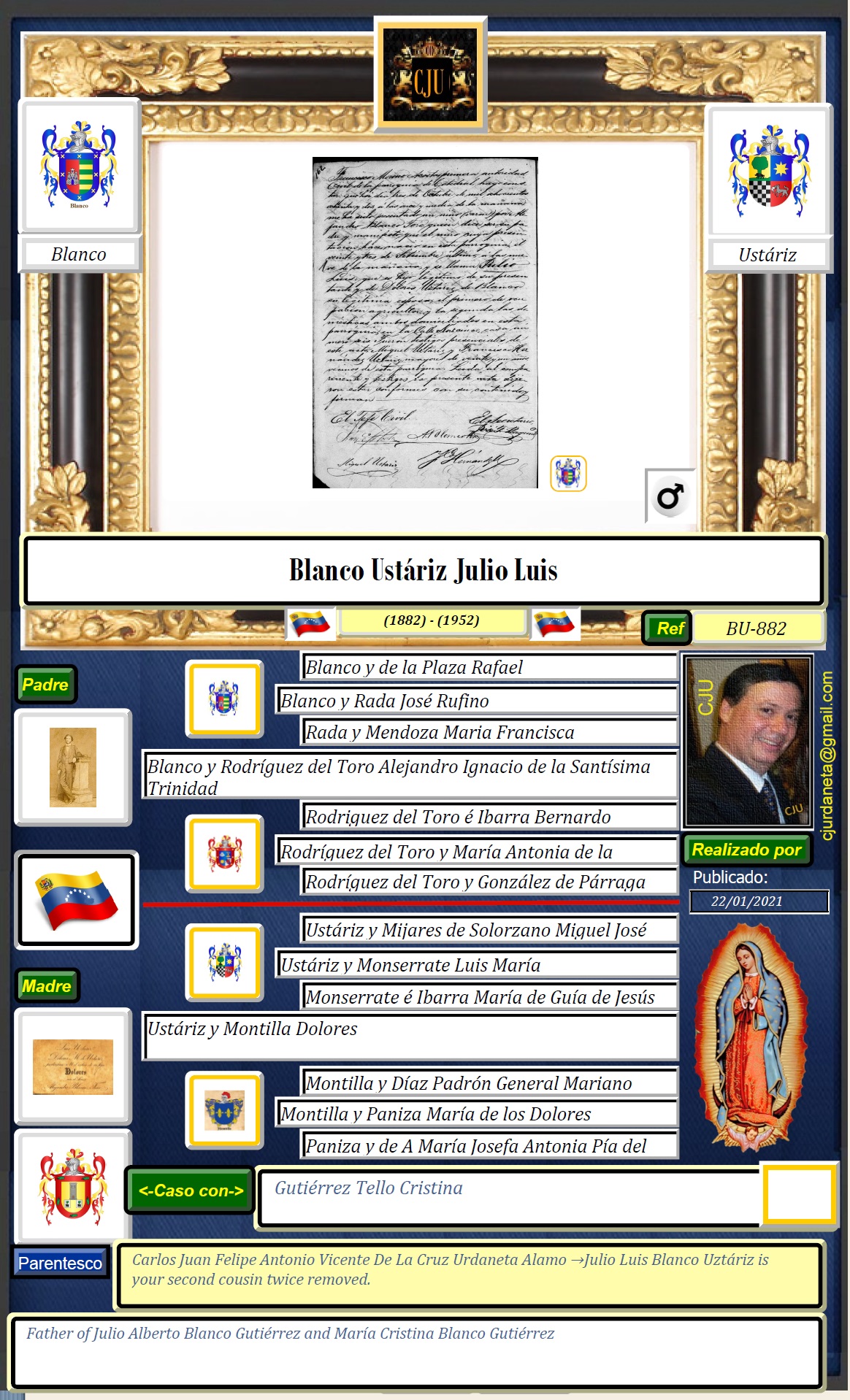de: Carlos Juan Felipe Antonio Vicente De La Cruz Urdaneta Alamo →Julio Luis Blanco Uztáriz is your second cousin twice removed.