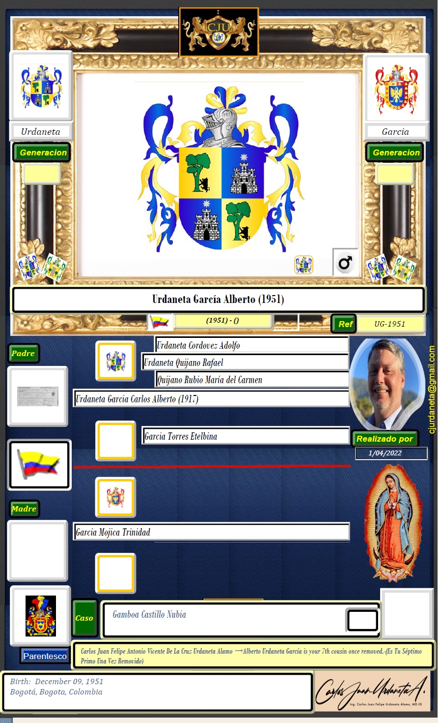 Padre: Urdaneta Garcia Carlos Alberto (1917) ____________________________________________________________________________ <----------------------------------------------------------------------------------------------> (Linea Paterna) <----------------------------------------------------------------------------------------------> Alberto Urdaneta García is your 7th cousin once removed.of→ Carlos Juan Felipe Antonio Vicente De La Cruz Urdaneta Alamo→ Dr. Enrique Jorge Urdaneta Lecuna your father → Dr. Carlos Urdaneta Carrillo his father → Dr. Enrique Urdaneta Maya his father → Ezequiel Urdaneta Morantes his father → Coronel Juan Nepomuceno de los Dolores Urdaneta y Montiel his father → José Felipe Felix Urdaneta Barrenechea y Espina his father → Bernardo Urdaneta Barrenechea y Matos his father → Juana Catalina Urdaneta Barrenechea y Matos his sister → Juana Bárbara Troconis y Urdaneta her daughter → Francisco José Javier Urdaneta y Troconis her son → Francisco Urdaneta y González de Rivadavia his son → Manuel Eusebio (Estanislao) Urdaneta y Girardot his son → Adolfo Urdaneta Cordovez his son → Rafael Urdaneta Quijano his son → Carlos Alberto Urdaneta Quijano his son → Alberto Urdaneta García his sonConsistency CheckShow short path | Share this path ADD PHOTO Alberto Urdaneta García Enter his email Gender: Male Birth: December 09, 1951 Bogotá, Bogota, Colombia Immediate Family: Son of Carlos Alberto Urdaneta Quijano and Trinidad Garcia Mojica Husband of Nubia Gamboa Castillo Father of Paola Urdaneta Gamboa Added by: Carlos Juan Urdaneta Alamo on today Managed by: Carlos Juan Urdaneta Alamo 0 Matches Research this Person View Tree Edit Profile Overview Media Timeline Discussions Sources Revisions DNA Aboutedit | history Share some things about Alberto Urdaneta García. View All Immediate Family Text ViewAdd FamilyEdit Showing 4 people Nubia Gamboa Castillo wife Paola Urdaneta Gamboa daughter Carlos Alberto Urdaneta Quijano father Trinidad Garcia Mojica mother <----------------------------------------------------------------------------------------------> Agregado por: Ing. Carlos Juan Felipe Urdaneta Alamo, MD.IG. <----------------------------------------------------------------------------------------------> Linaje N°1 FAMILIA |•••► URDANETA 1.- 1951 URDANETA GARCÍA ALBERTO (1951) |•••► Pais:Colombia