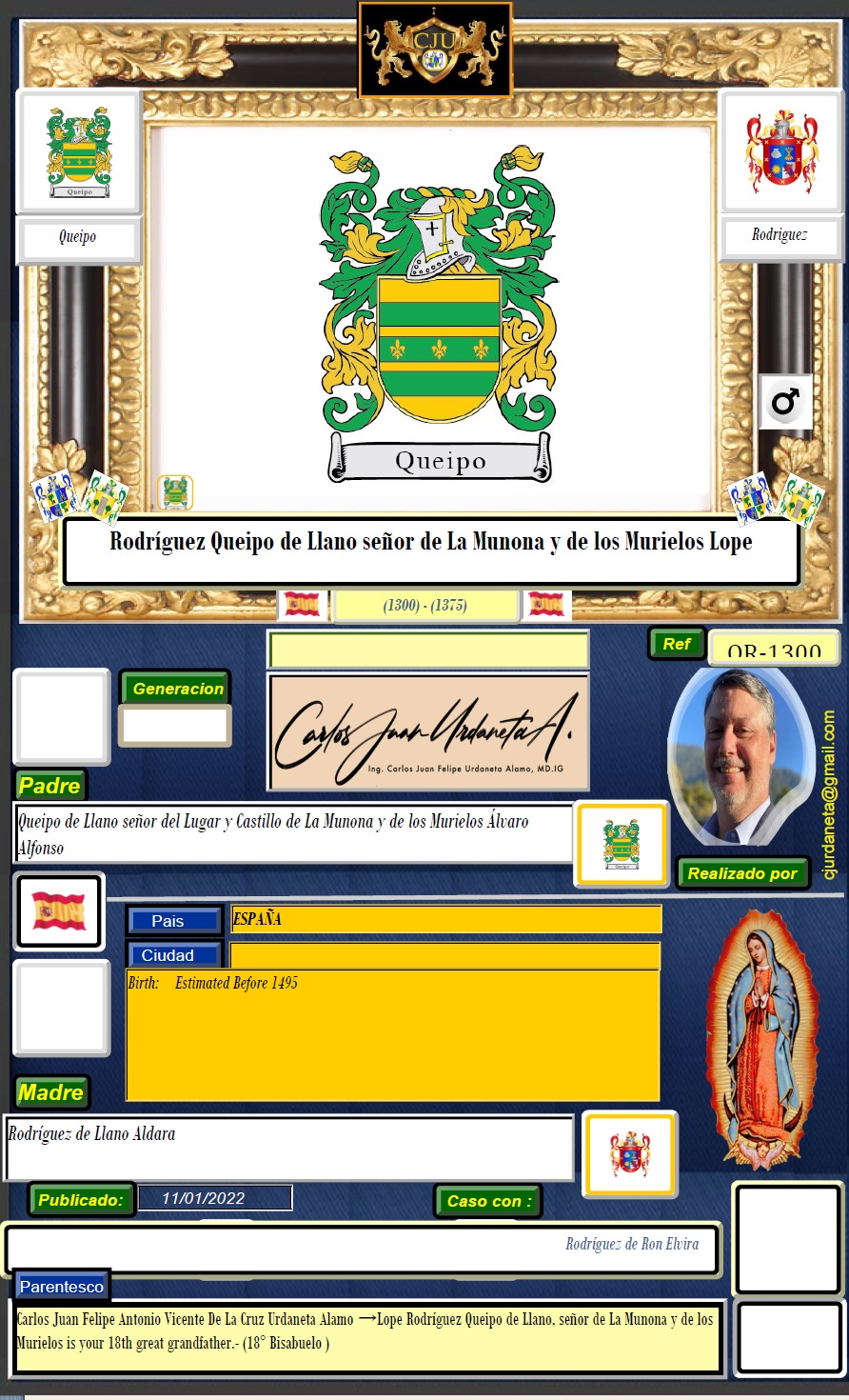 18° Bisabuelo/ Great Grandfather de: Carlos Juan Felipe Antonio Vicente De La Cruz Urdaneta Alamo →Lope Rodríguez Queipo de Llano, señor de La Munona y de los Murielos is your 18th great grandfather.