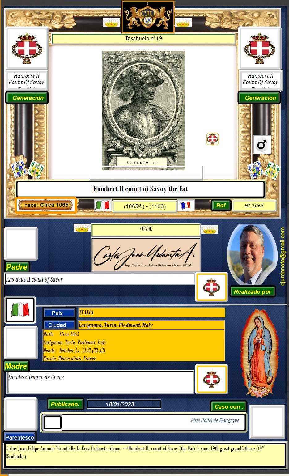 Humbert II, count of Savoy (the Fat) is your 19th great grandfather.of→ Carlos Juan Felipe Antonio Vicente De La Cruz Urdaneta Alamo→ Morella Álamo Borges