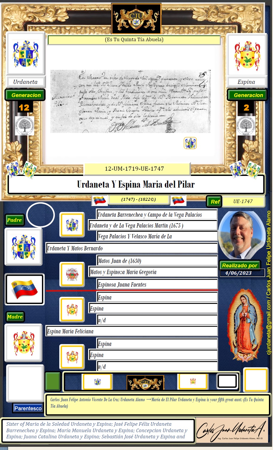 (Es Tu Quinta Tía Abuela)-is your fifth great aunt de: Carlos Juan Felipe Antonio Vicente De La Cruz Urdaneta Alamo →María de El Pilar Urdaneta y Espina is your fifth great aunt.